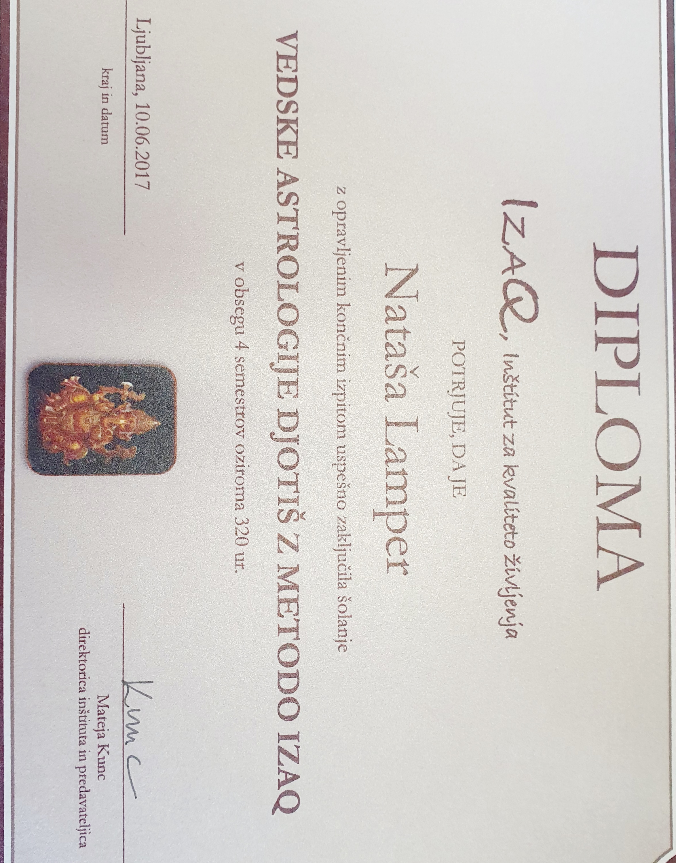 V času, ko so se mi stalno ponavljala ena in ista vprašanja in nisem vedela, kako narediti korak naprej, mi je Nataša s svojim svetovanjem zelo pomagala. Z vpogledom v astrološko karto mi je v nekaj besedah razjasnila mojo situacijo. Spoznala sem, zakaj se mi določene stvari dogajajo, kaj me ovira pri doseganju svojega cilja in na katero področje v življenju naj dam fokus, saj me tam planeti močno podpirajo. Res je lažje, ko pobliže pogledaš svojo situacijo, jo razumeš in dojameš, kako ti lahko to orodje pomaga pri načrtovanju, reševanju izzivov in pri novih korakih. Zelo sem ti hvaležna, da si mi odstrla tančico nevidnega. Hvala, Nataša. Se vidiva spet kmalu.