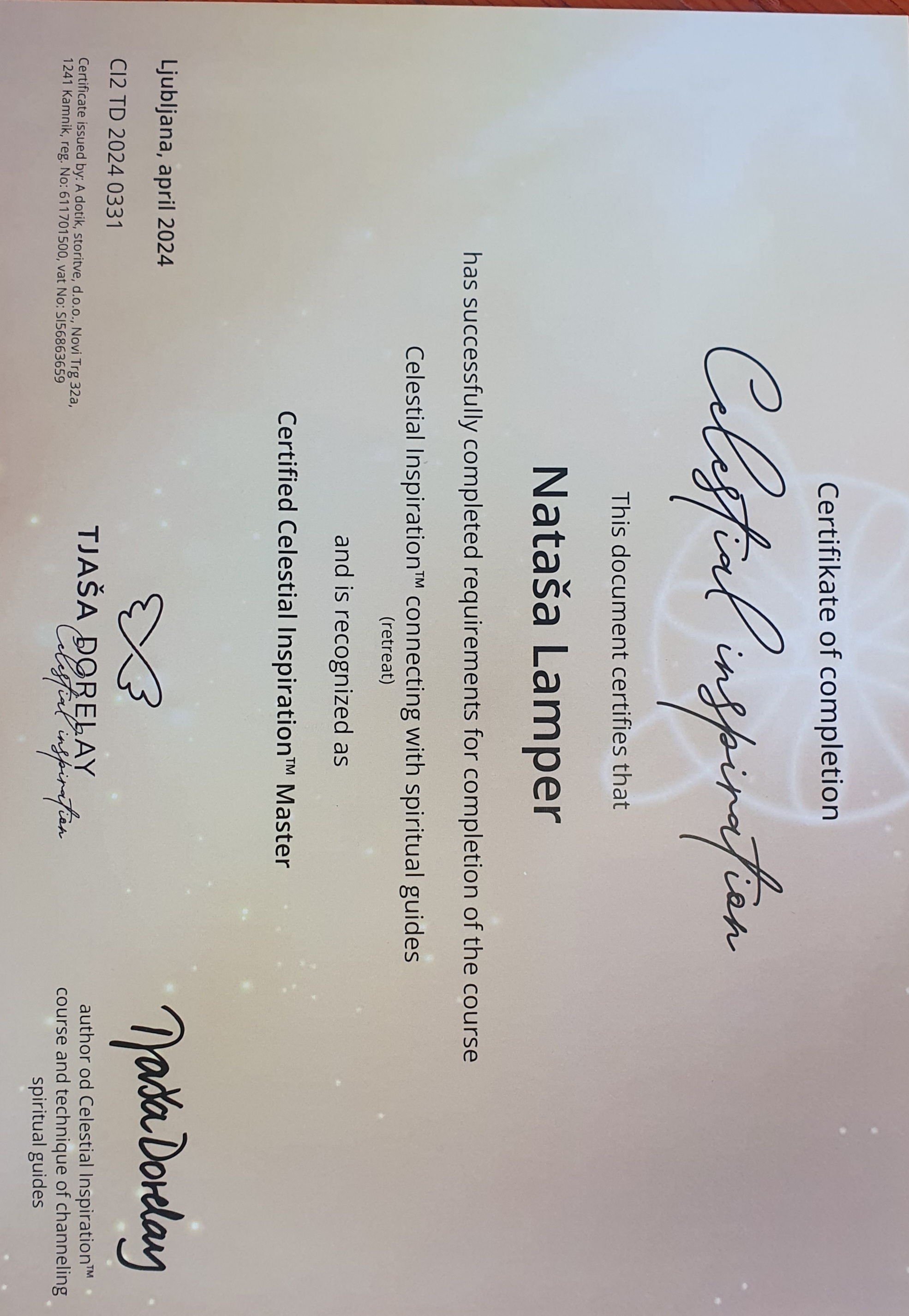 Certifikat za opravljen tečaj kanaliziranja pri Tjaši Dorelay.